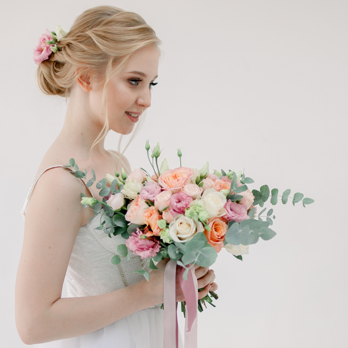 Зимой выбор растений для свадебной композиции ограничен. Фавориты — розы, хризантемы и лизиантусы.