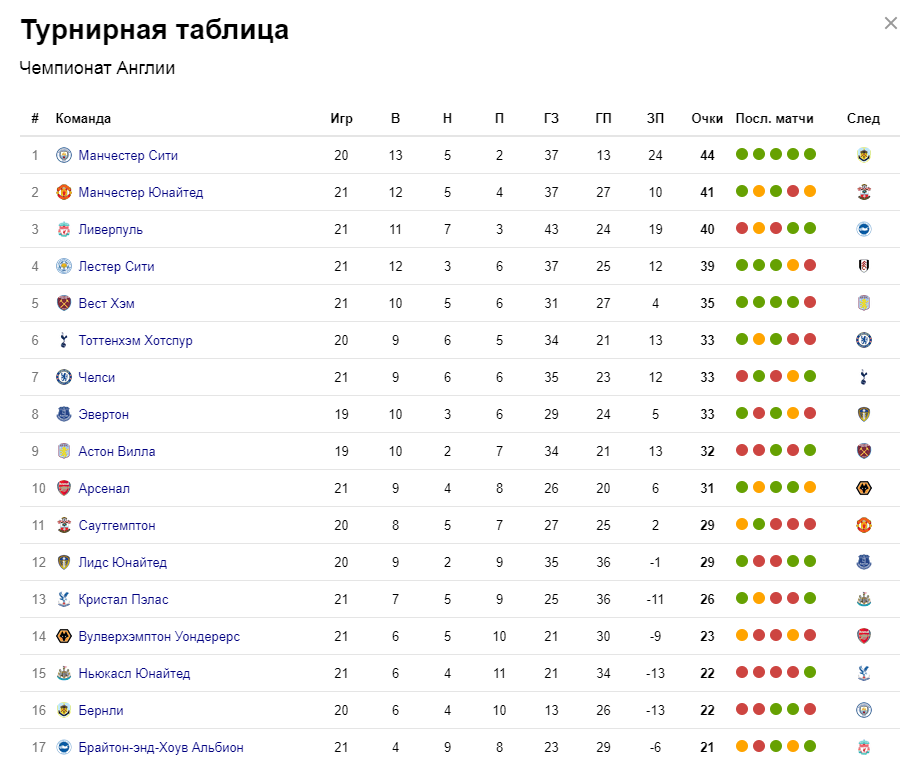 Турнирная таблица на сегодняшний день выглядит следующим образом: