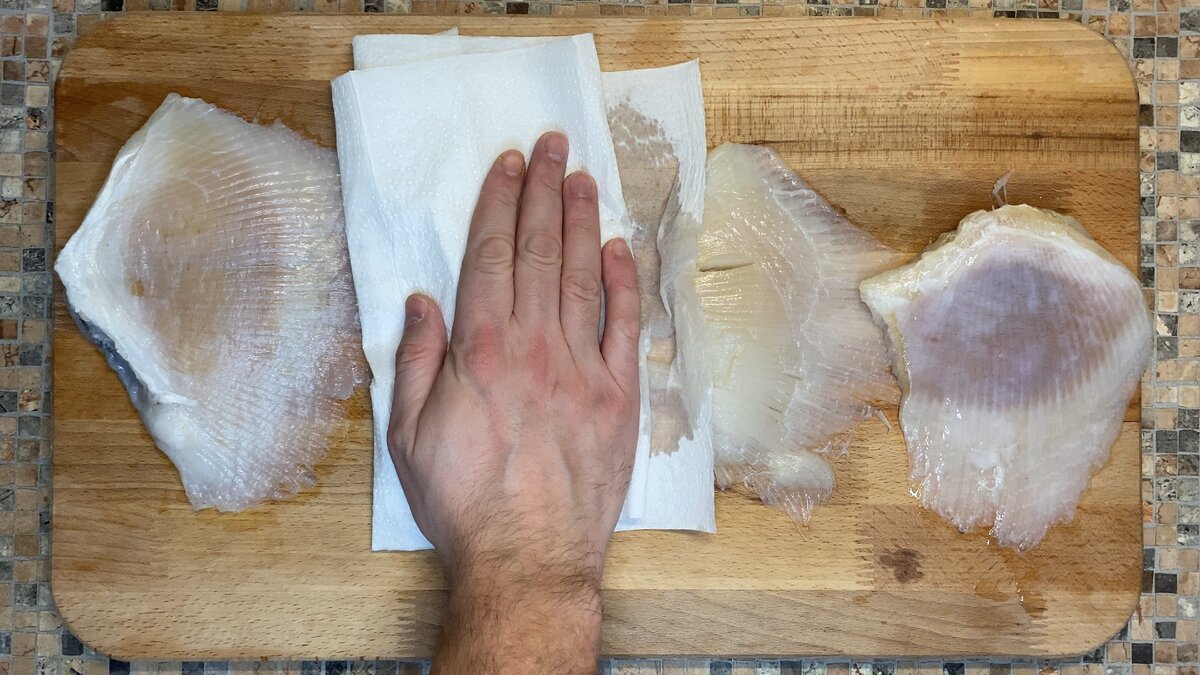 Взяли крылья ската. Просушили и посолили/поперчили с двух сторон (2 фото).