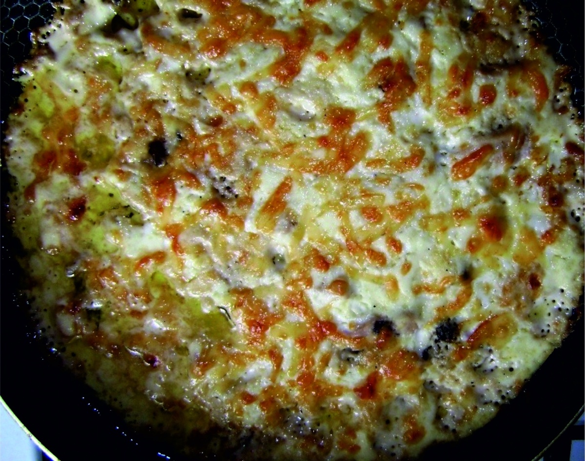 7) После действий предыдущего пункта в сковороду доложить грибы, подождать до момента, когда влага из грибов выпарится, затем все следует посолить и поперчить, затем перемешать и оставить жарится еще 6 минут, периодически перемешивая.