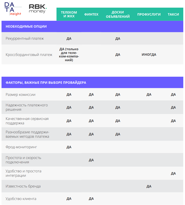 В рамках совместного исследования рынка онлайн-платежей компаниям Data Insight и RBK . money сформулировали отличительные особенности требований к настройкам платежных решений, критичные для игроков рынка в сегментах: сегменты: телеком и ЖКХ, финтех-компании, доски объявлений и маркетплейсы, профессиональные услуги, такси.