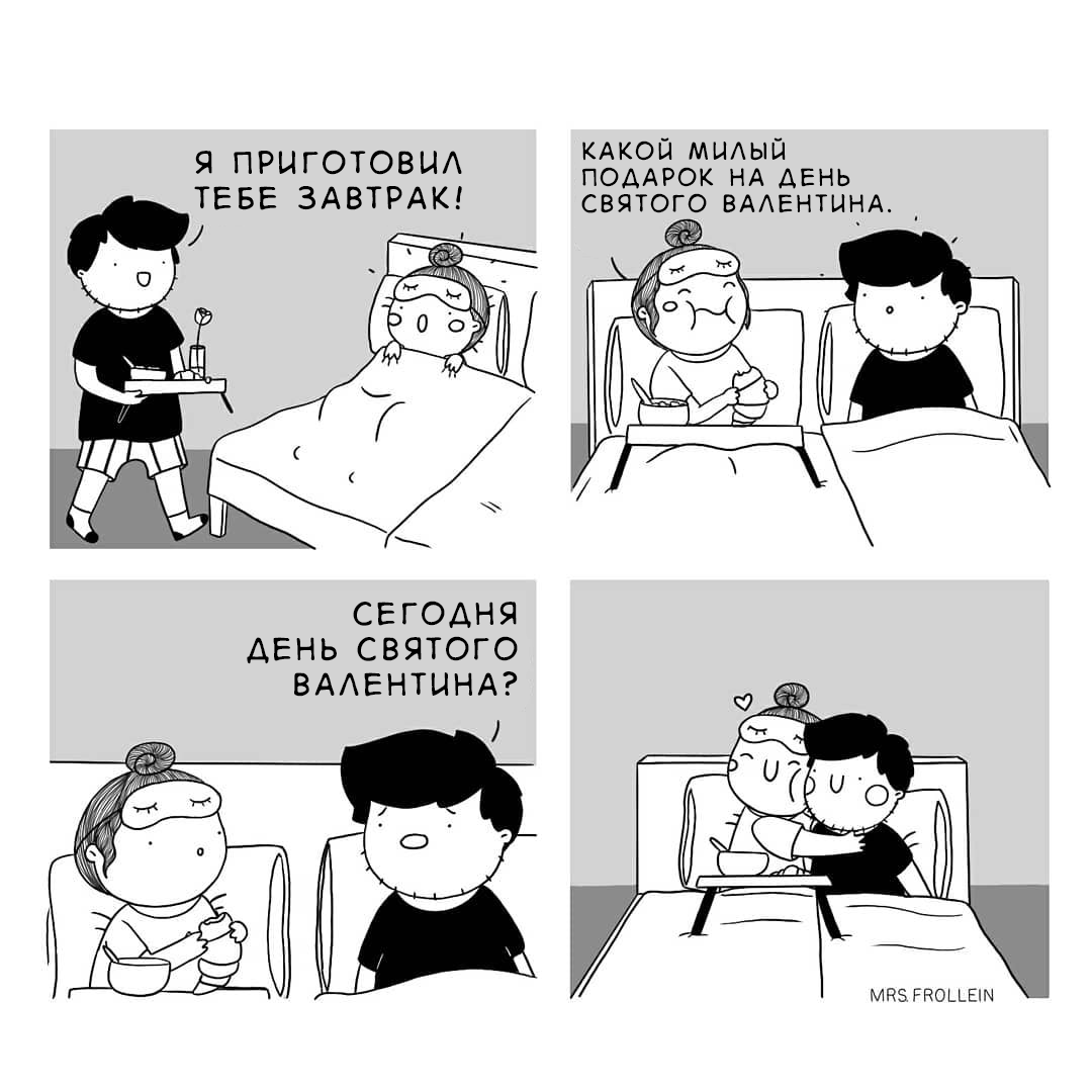 Немецкая художница Валери Минелли (Valérie Minelli), известная в сети под псевдонимом Mrs. Frollein (Миссис Фроллейн), рисует милые комиксы об отношениях. Само собой, с такой тематикой было сложно обойти стороной самый романтичный праздник в году, поэтому аккурат к одному из Дней святого Валентина художница нарисовала следующий комикс.