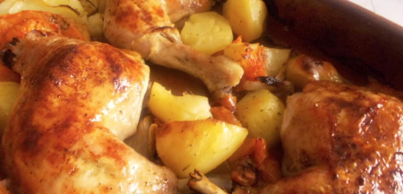 В форму выкладываем сначала картофель с луком, а за тем бедра или ножки куриные.