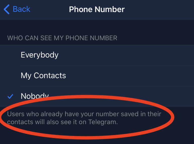 Руководство Telegram ответило новой возможностью указать «Никто» в опции «Кто видит мой номер телефона». Гениальное решение, способное решить все проблемы пробива мобильных номеров, но не тут-то было... Опция «Никто» в ее первой реализации – это обман пользователей со стороны Telegram. Она по-прежнему позволяла получать данные об аккаунте Telegram всем, у кого привязанный к этому аккаунту номер телефона добавлен в список контактов. Да, вы все правильно прочитали: это была просто пыль в глаза.