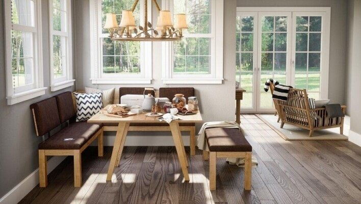 Поместите скамейки вдоль двух стен или в углу, а затем добавьте стул, а лучше табурет на торцевой стороне.