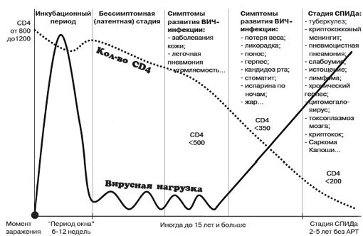 На приведённой выше схеме видно, что вирусная нагрузка взлетает вверх в первые четыре месяца (до года) после заражения, когда человек ещё даже не знает о том, что он болен. И уже через несколько лет после заражения.