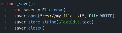 Определяем новую переменную saver как новый файл. В этот файл открываем файл my_file.txt с флагом WRITE (записать). Тут важен следующий момент — путь к файлу. Лучше вместо RES использовать USER . В этом случае файл будет создаваться в папке пользователя (%appdata%) а не в папке с ресурсами игры. Далее при помощи метода store_string() мы пишем в файл данные в виде текста. После чего файл необходимо закрыть.