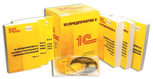 Фирменные жёлтые картонные коробки с программными продуктами семейства "1С:Предприятие 8" обычно включают в себя: