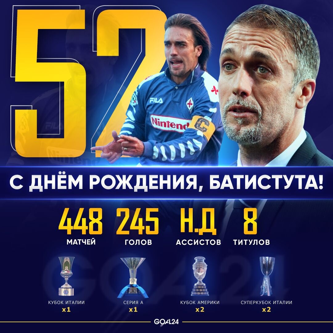 🇦🇷 Габриэль Омар Батистута родился 1 февраля 1969 года в Реконкисте, Аргентина. Прозвища: «Батигол», «Король Лев».