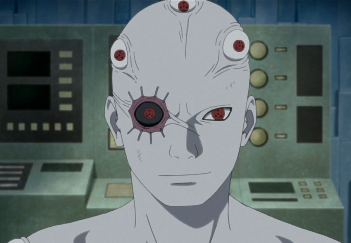 Шин — высокий, бледный и безволосый мужчина. Он обладает горизонтальным шрамом, проходящим от его правого виска к переносице над его правым глазом. Ради экспериментов по своему клонированию он пожертвовал все свои зубы, а его правую руку ампутировали до бицепса. В его тело имплантировано множество дополнительных Шаринганов: один в левой глазнице, шесть можно видеть на левой руке, один на правом плече, один на левой груди и один на правой, четыре на культе правой руки и как минимум три на голове. Его правый глаз держат открытым восемь стежков, а его склера кажется темной и налитой кровью. В аниме, Шин потерял левую ногу ниже колена во время своей последней битвы с Саске.