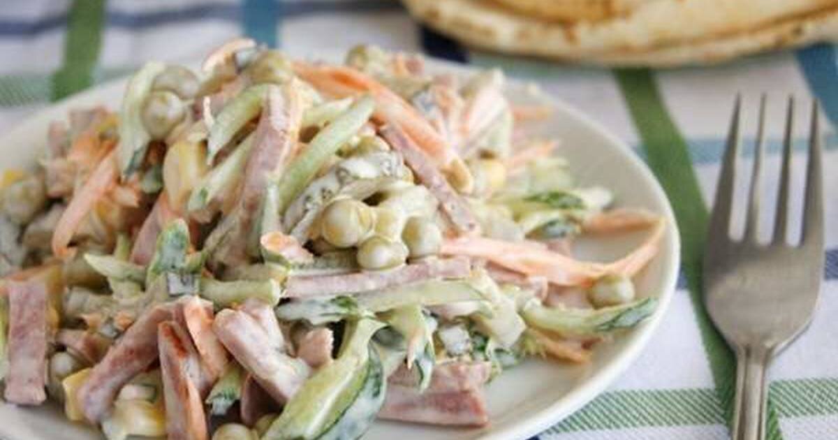 Понадобится (всего по вкусу):сырая морковьколбасамаринованные огурцыконсервированный зеленый горошекконсервированная кукурузасвежие огурцы