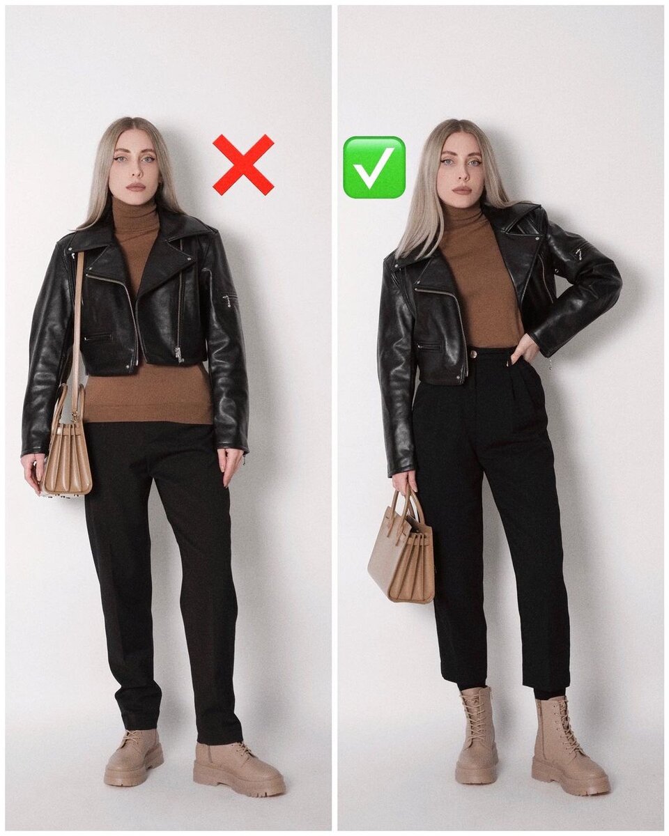 Из-под укороченной косухи не должно ничего выглядывать. С укороченной верхней одеждой мы заправляем все!