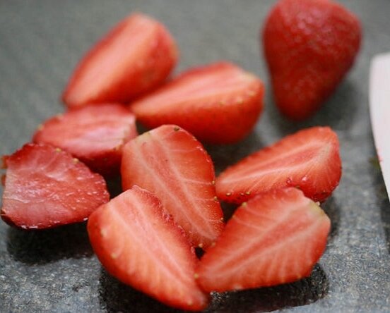 - Клубнику вымыть, разрезать каждую ягоду пополам (очень крупные ягоды разрезать на 4 части.