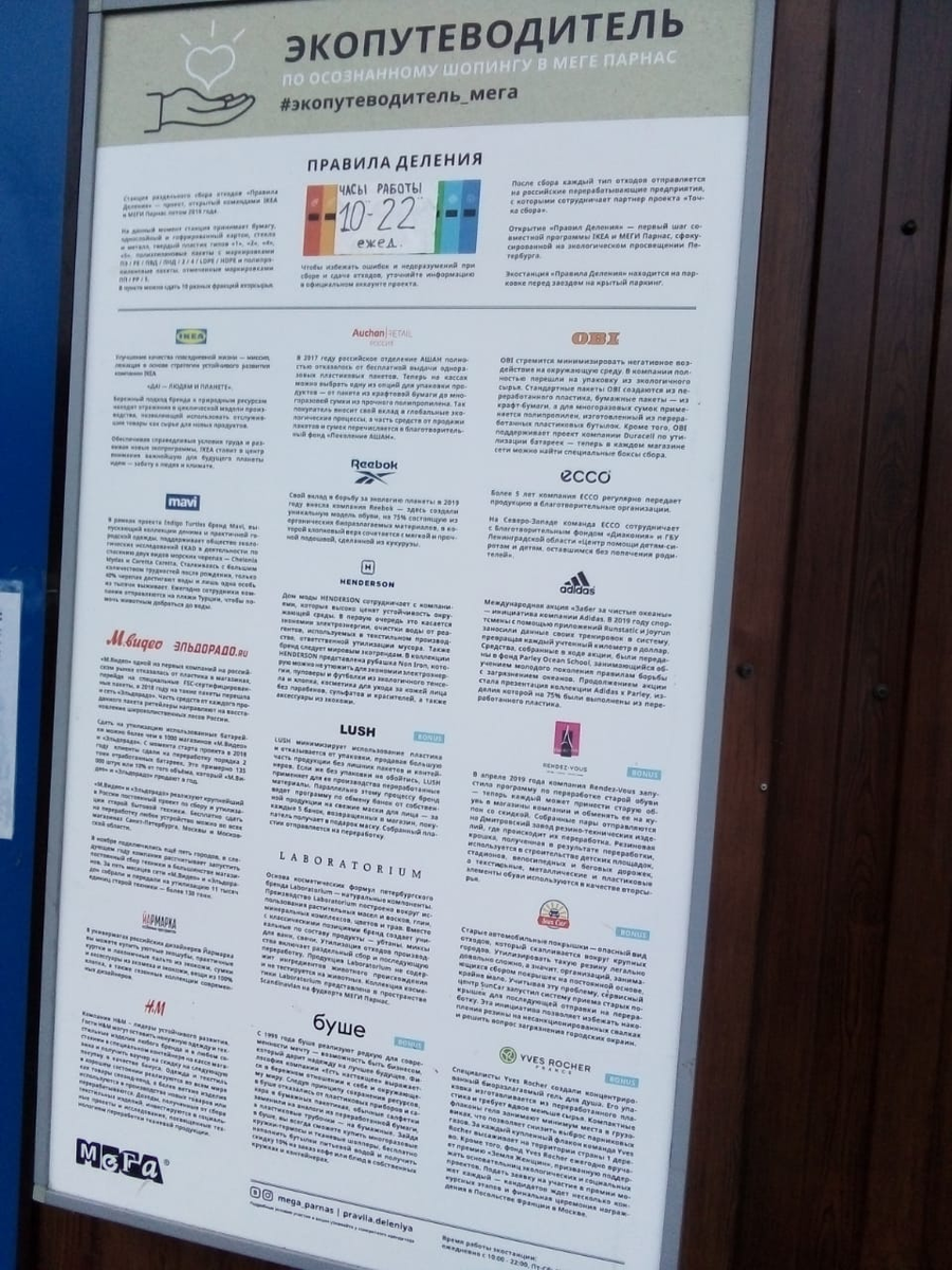 В статье я привела примеры экологичных опций магазинов Меги Парнас, города Мурино в Ленинградской области и некоторых других за ее пределами.