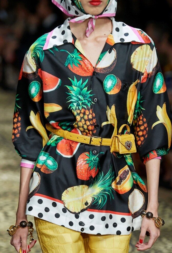 Второй сезон подряд вместе с традиционными цветами, листьями и растительными орнаментами набивкой для модных образов на рубашках и свитшотах разных коллекций дизайнеров расцветают апельсины и бананы и другие вкусные плоды.