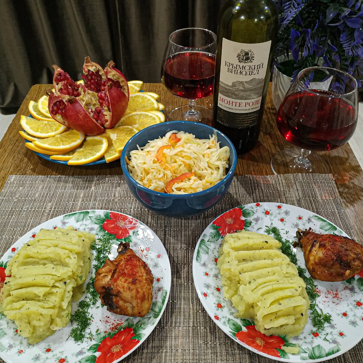 Незамысловатый такой ужин получился, пюрешка (с секретом), курочка в маринаде, капуста Провансаль, бутылочка Крымского вина, что бы покушать и расслабиться, что собственно мы и сделали.