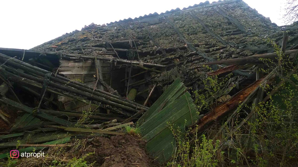 Все крыши домов в этой деревне покрыты дак называемой дранкой. Её прибивали к доскам обрешётки гвоздями. Их настолько много, что крыша где уже нет дранки выглядит как дикобраз. Заходить, вернее заползать по другому и не скажешь, очень опасно. Вся эта шаткая куча брёвен досок и гвоздей в любой момент, от любого прикосновения может поехать в любую сторону и придавить.