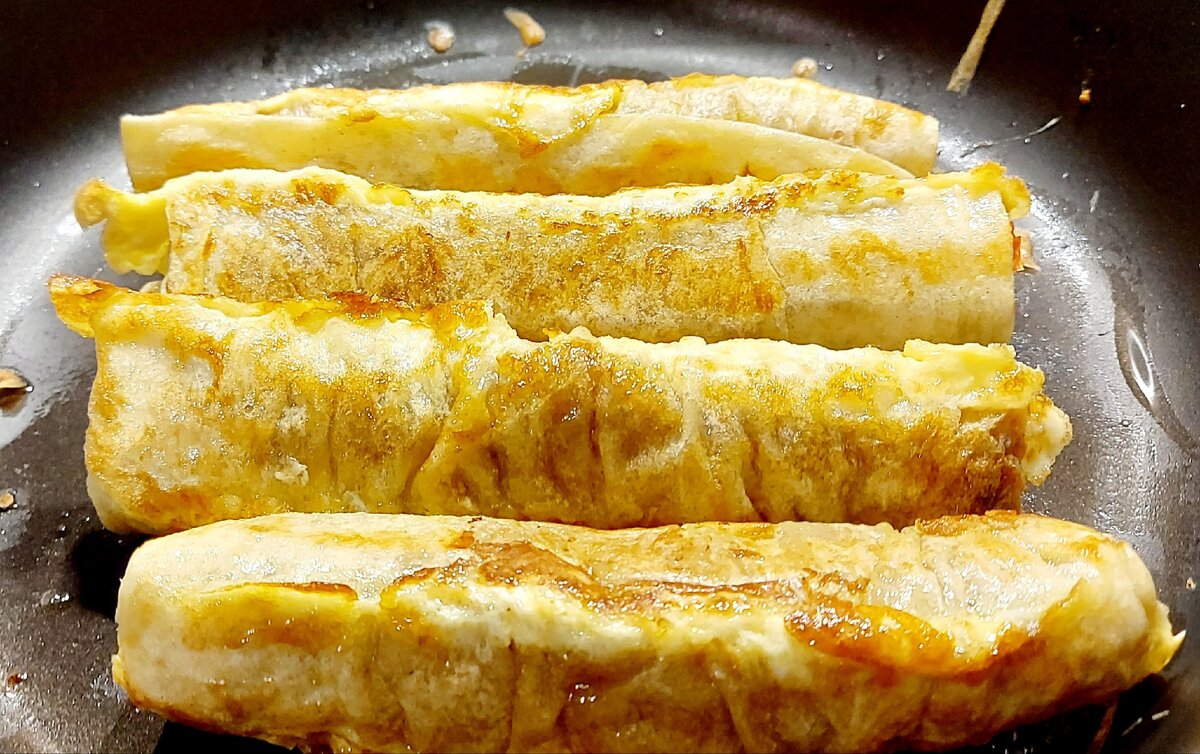 7. Рулетики обмокнуть в яичной смеси. Обжарить под закрытой крышкой на сковороде со всех сторон до золотистой корочки на небольшом количестве растительного масла. Огонь ниже среднего.