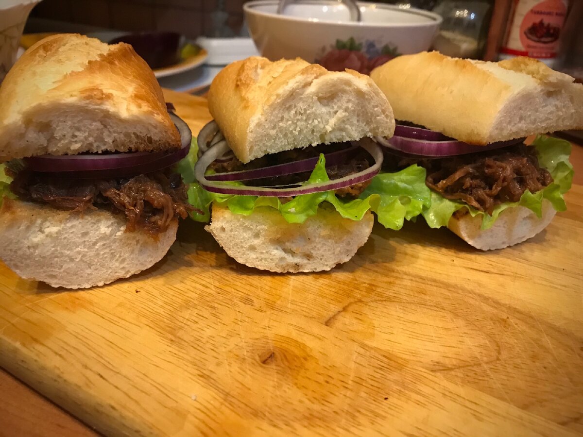 В оригинальном рецепте на хлеб укладывали лист салата, говядину и лук, сверху накрывали второй частью булки и всё😋