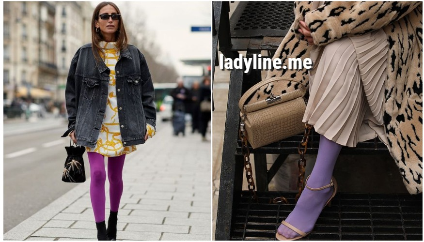 Матовые сиреневые колготы отлично смотрятся с нарядами такими же яркими и пестрыми. К примеру, сочетание: сиреневые колготки + красная водолазка + красная мини юбка вполне себе удобоваримо. Также обратите свое внимание, что чаще всего стилисты комбинируют сиреневые матовые колготки с вещами в анималистический принт — запомните этот тандем, он пригодится вам в 2021 году.