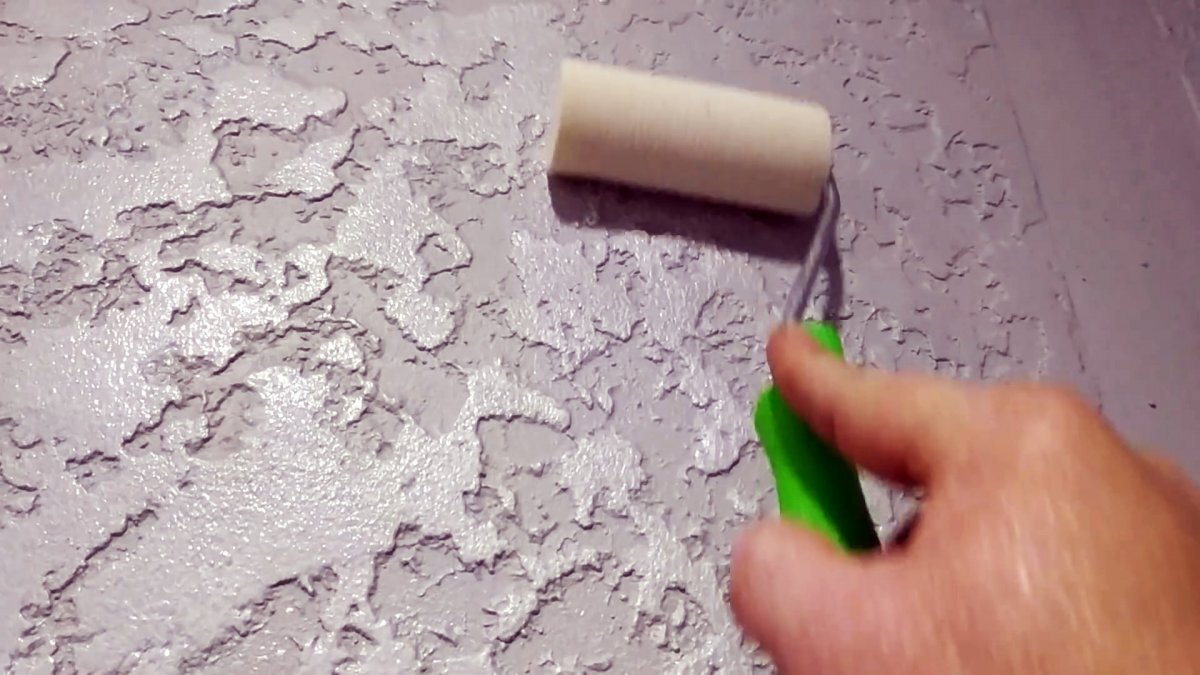 Когда работа над рельефом завершена, наносится грунтовка с помощью валика с длинным ворсом. Грунтовка способствует легкому нанесению краски, увеличивается прочность отделки и закрепляется нанесенный слой штукатурки. После высыхания грунтовки стены окрашиваются.