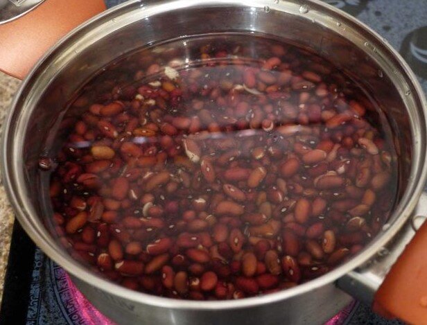1. В первую очередь промываем фасоль, кладем ее в кастрюлю, заливаем холодной водой и ставим на огонь. Через минут 15-20 после того как вода закипит, сливаем воду.
