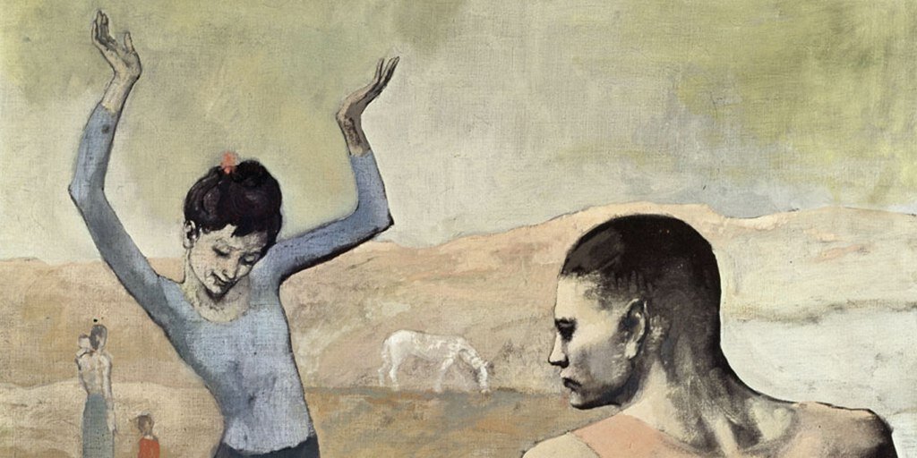 На горизонте Пикассо изобразил часть бродячей труппы, какие он видел в детстве на родине. Потому пейзаж так напоминает испанские земли.