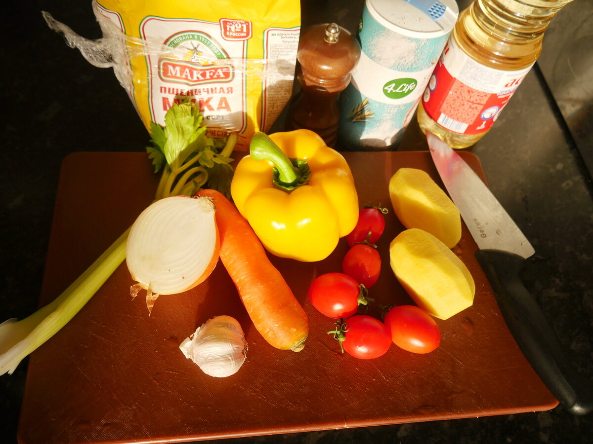 Килограмм бычьих хвостов, две картофелины, половина болгарского перца, половина крупной моркови, стебель сельдерея, две столовые ложки муки, один большой помидор или три-четыре черри, половина большой луковицы, соль и перец, растительное масло.