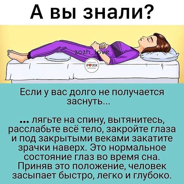 Не можешь заснуть ночами?1)Лягте на спину ,вытенитесь расслабьте все тело,закройте глаза и под закрытыми веками закатите зрачки наверх.Это нормальное состояние глаз во вреия сна.