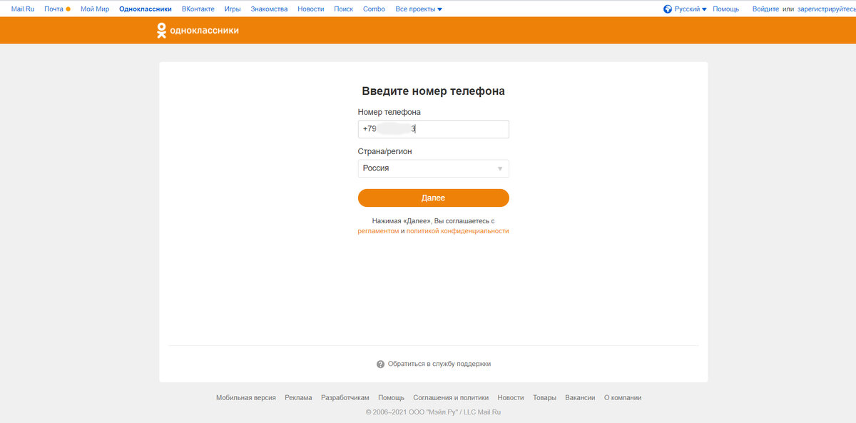 3. Введите свой номер телефона без семерки, укажите страну проживания из предложенных вариантов, и нажмите «Далее».