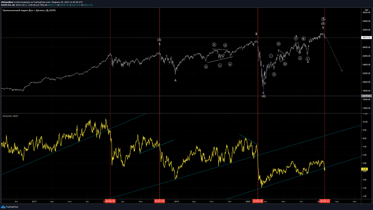 - Снизу желтой линией показан график соотношения VVIX/VIX.