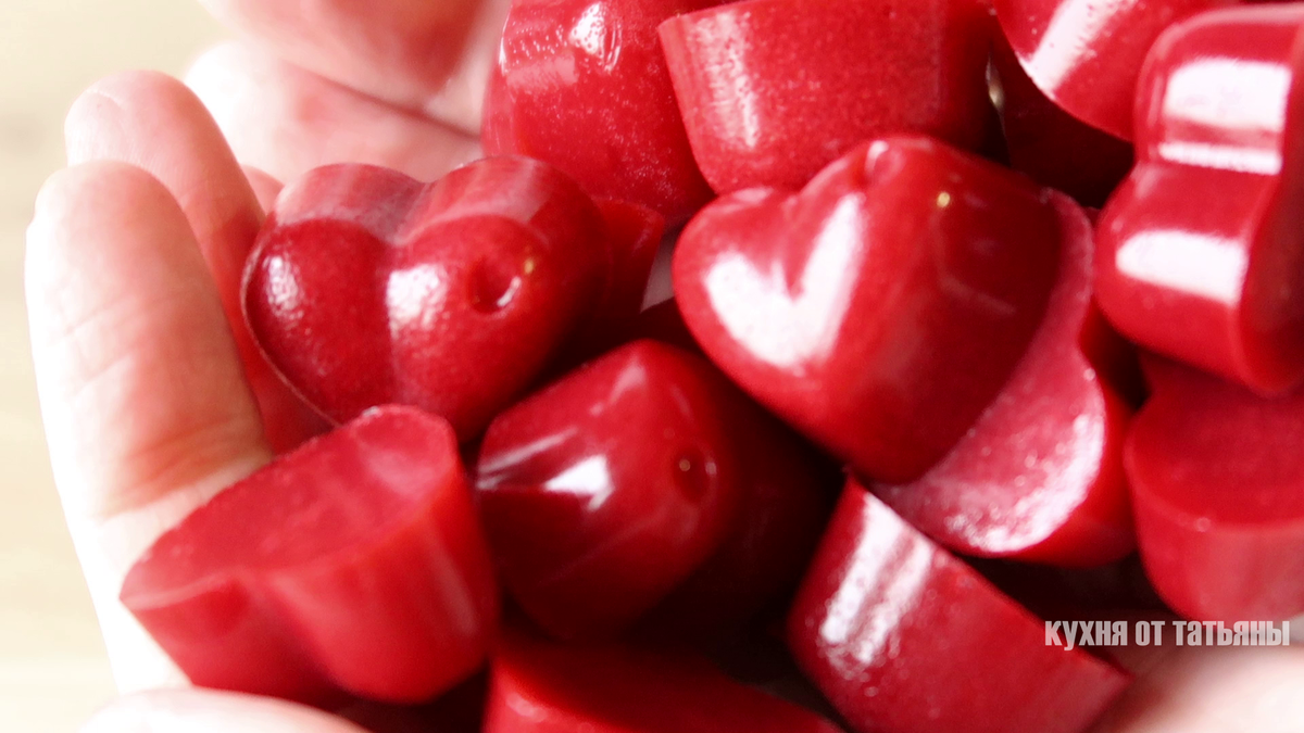 Всем привет. Сегодня, у меня рецепт мармелада в домашних условиях. Он приготовлен на агар-агаре. Мармелад я вырезала виде красных сердечек. Конечно, его можно приготовить любой формы, главное, что он очень вкусный! ----------------------------------------- Сначала, надо приготовить агар-агар. Высыпаю его в небольшую кастрюлю, заливаю водой и хорошо перемешиваю. Агар-агар, пока готовятся ягоды, хорошо раствориться в воде. Мармелад в этом рецепте - буду делать из вишни. Я взяла замороженную. Вишню насыпаю в кастрюлю и добавляю туда сахар. Ставлю невысокую температуру и жду когда сахар начнет растворятся. Вишню периодически перемешиваю, чтобы он не подгорел. Вишня начала оттаивать, а сахар растворяться. В кастрюле появилось много сока. Продолжаю перемешивать, пока вишня не станет полностью мягкой и сахар растворится. Теперь, надо всю массу хорошо пробить блендером. Хорошо ее измельчаю, до тех пор, пока она не станет однородной. Агар-агар хорошо растворился в воде. Ставлю средн