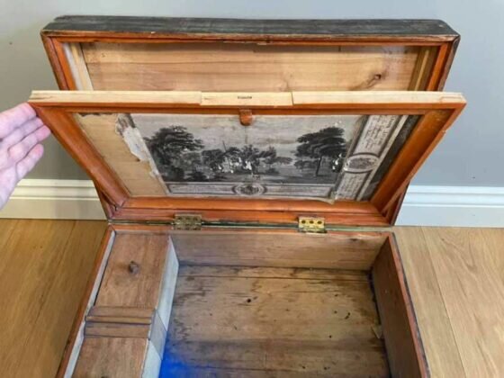 На задней стенке сундука приклеена старинная гравюра по рисунку художника Вавилия Причетникова «Обелискъ в Саду его Сиятельства Князя Александра Борисовича Куракина в селе Его Надеждино».