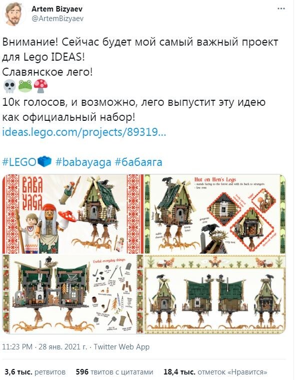 Питерский художник Артём Бизяев загрузил на сайт LEGO концепт своего набора по мотивам славянских сказок. Он рассказал об этом в Twitter. Меньше, чем за сутки идея набрала необходимое число голосов.