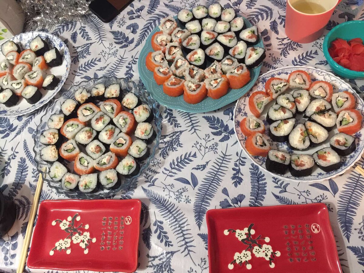 В моей семье все любители роллов и суши. Решила я устроить вечеринку роллов! Так, ну чтобы объесться) Поэтому вы берите только половину ингредиентов от мной указанных ниже. Кстати, хочу сразу подчеркнуть, что потраченные деньги вполне оправдаются, если сравнивать с заказом на дом. Такое количество выйдет в два раза дешевле. Что нам понадобится: Листы нори – 10 шт. Рис для суши, можно заменить круглозерным – 700 г Рисовый уксус, или обычный 9% Для начинки: Сыр филадельфия, или сливочный творожный – 2 баночки по 140 г Огурец-1-3шт зависит от размера Красная рыба-500 г (сёмга или форель) Креветки -500 г Крабовые палочки-1упаковка Бекон-для украшения ролла сверху Яйца (для японского омлета)-2-3яйца Куриное филе-300г Соевый соус Имбирь Васаби Палочки для суши И, разумеется, цинковка для сворачивания роллов Пугаться сразу такому обилию не надо, просто я решила разнообразить начинки. А можно вполне остановиться на одной. 1) Сначала сварим рис для роллов Промываем рис несколько раз, пока вода
