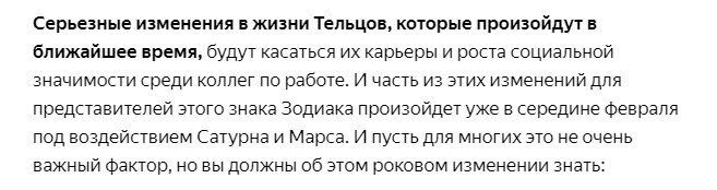 Много кто из представителей данного знака зодиака добивается больших высот и успехов в карьерной лестнице за счёт того, что упорно на трудиться на благо со своей компании и собственного продвижения по карьерной лестнице. Но сегодня расклад карт Таро по данному знаку Зодиака навел на мысль, что ближайшее время в жизни Тельцов будут происходить явные изменения. Звёзды также подтверждают это. В жизни Тельцов предстоят события, которые полностью смогут перевернуть жизнь тех представителей данного знака зодиака, которые еще находятся в самом начале пути и не успели достигнуть каких-то карьерных высот в этой жизни. Их ждут потрясающие изменения не только в плане карьеры , но и положительные изменения в личной жизни и в плане здоровья. Многие представители Тельцов имеют шанс встретить свою половинку уже в конце февраля. То есть для них этот год станет максимально успешным в плане личных взаимоотношений. О том, какие ещё изменения ждут представителей Тельцов предлагаю вам прочитать дальше: