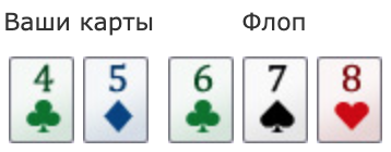 Флеш-дро. Четыре карты одной масти дают нам флеш-дро, которому, чтобы стать флешем, не хватает одной карты той же масти.