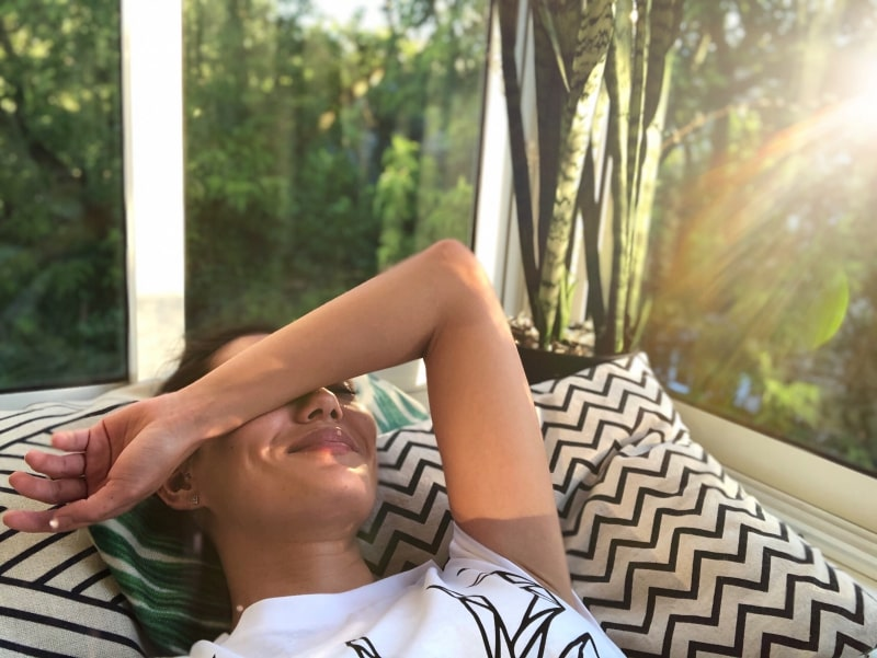 Лежанка получилась довольно высокой. Хорошо, что этаж у нас 5-й, нет высоток напротив, а вокруг дома деревья с плотной кроной. Чтобы на нее было удобно залезать, я сместила ящики в виде ступеньки, а упорядоченный хлам позади не дает верхней антресоли сдвинуться дальше и упасть. Конструкция получилась на удивление крепкая и выдерживает нас с мужем вдвоем.