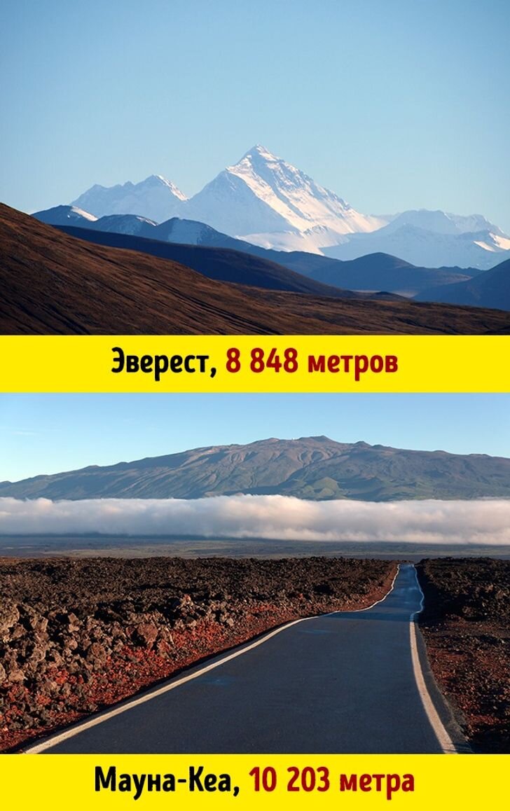 Высота вулкана Мауна-Кеа над уровнем моря составляет 4 205 метров, однако большая его часть скрыта под водой. Общая же высота этой вершины, находящейся на Гавайских островах, составляет 10 203 метра, то есть на 1 355 больше, чем Эвереста.