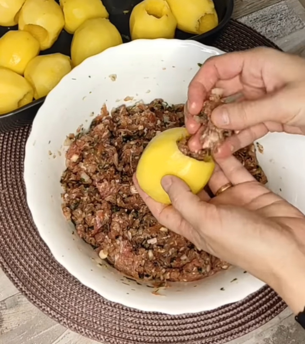 У картофеля вырезаем сердцевину, далее начиняем её начинкой.