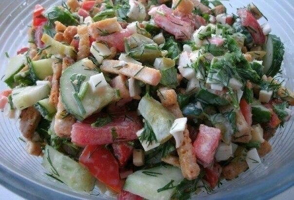 Нарезаем все ингредиенты (кроме сухариков), солим, перчим, перемешиваем с майонезом, и добавляем пачку сухариков. Еще раз перемешиваем, и готово!