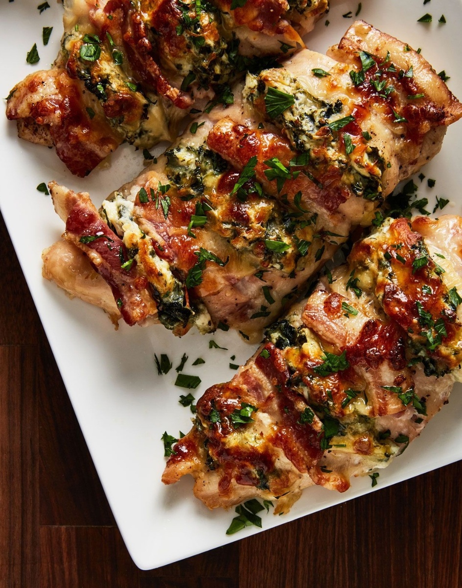 Выпекать, пока курица не прожарится, а бекон не станет хрустящим, — 35 минут.