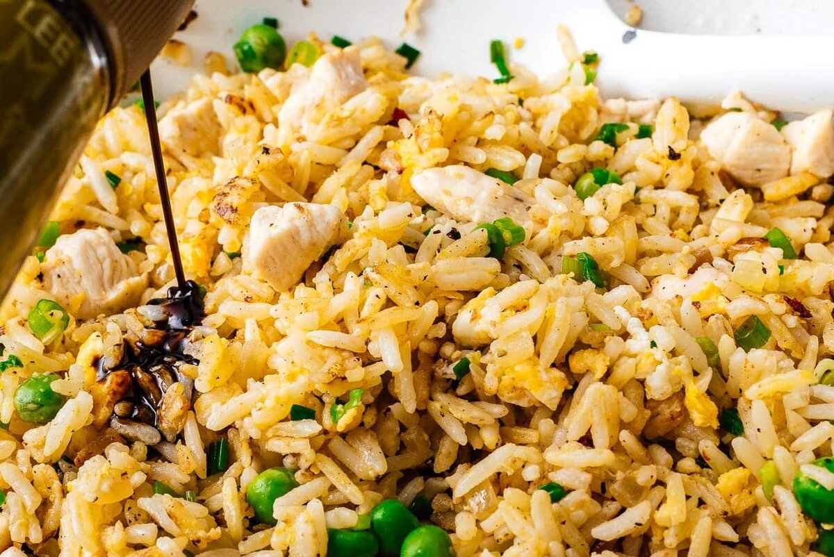 Есть жареный рис с соевым соусом, жареный рис с солью или и то, и другое. Жареный рис с курицей приправлен солью по вкусу. Приправы - это последний шаг: попробуйте жареный рис и приправьте его соответствующим образом.