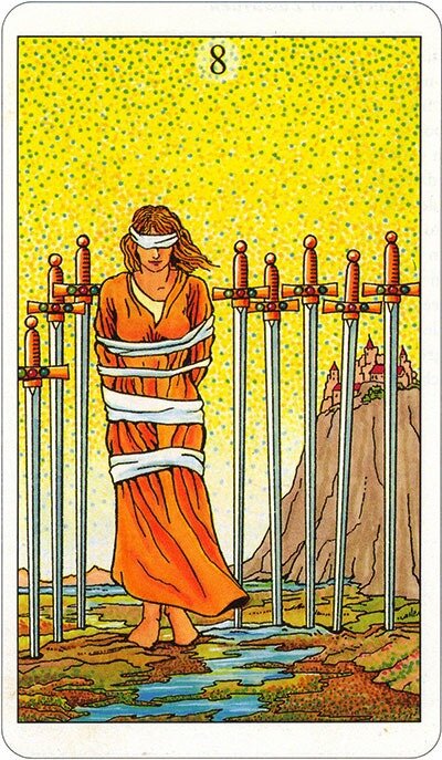 Чем дальше в лес, тем толще партизаны. Эта поговорка справедлива для масти мечей. Чем выше цифра на карте, тем сильнее накал негативных страстей. 8 мечей начинает этот марш негатива. Как я уже говорил раньше, разбираться в 100500 трактовках этой карты, которые понаписали уважаемые тарологи за время существования колоды ТАРО, я не вижу смысла. На начальном этапе вас это только запутает. Поэтому запомните, если вы видите перед собой 8 мечей, то речь идет только об одном — отчаянье. И не просто отчаянье, а полная безвыходность, о которой человек прекрасно знает и понимает ее.