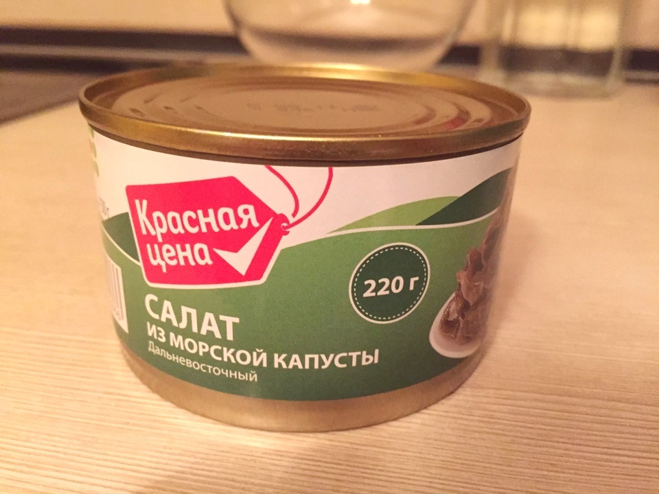 Много воды утекло с тех пор, и сегодня, гуляя по любимой Пятерке мой взгляд устремился на полку с зелеными баночками. Переборов свою психологическую травму я все же решился побаловать себя давно забытым вкусом любимой морской капусты и взять баночку под маркой "Красная цена".