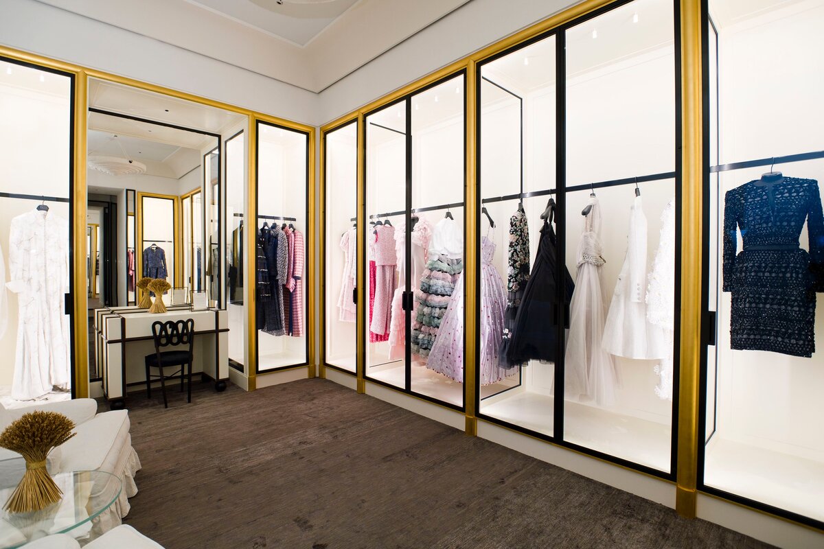 «Я хотел, чтобы весь проект был в духе Коко», - сказала Гранж. «Изображение должно быть очень точным. Карл тоже этого хотел. У этого дома необычное название, необычная ДНК, и всё это отражено в этом салоне». Здесь есть три просторные личные примерочные, разделенные ширмами, покрытыми шипами серого штофа. В задней комнате красочные платья из весенней коллекции от кутюр Виар представлены в стеклянных шкафах с позолоченными рамами, которые перекликаются с позолоченными снопами пшеницы, разбросанными по комнате. Перед туалетным столиком стоит черный стул Gio Ponti.