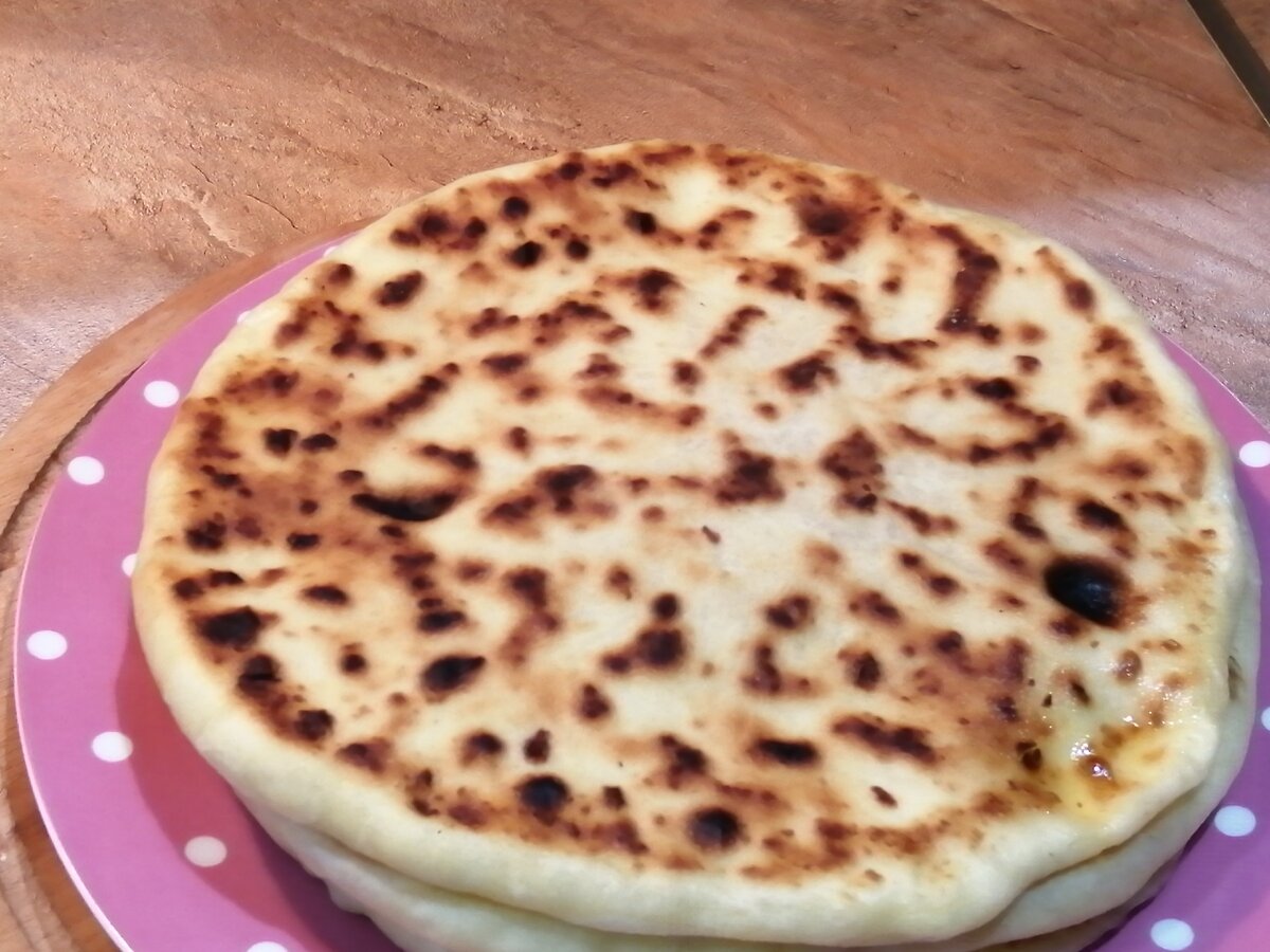 Далее, нагреваем сковородку и обжариваем с двух сторон лепешку, без масла, закрывая крышкой