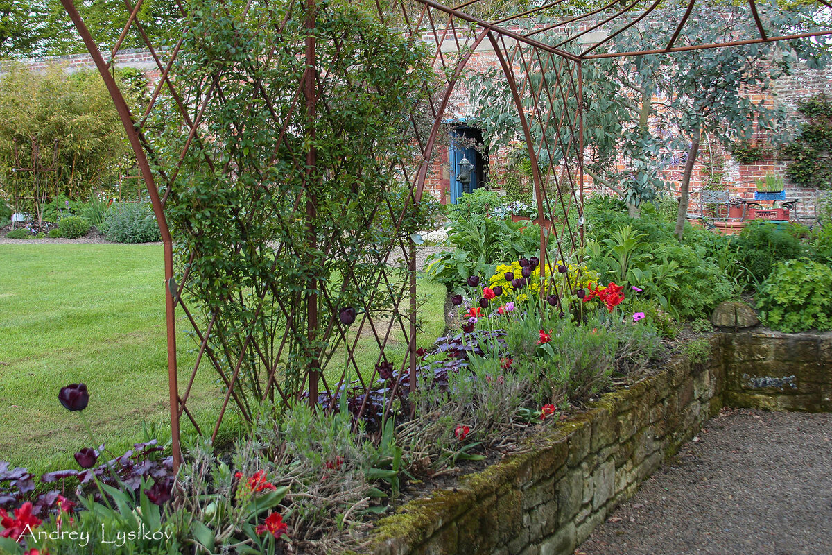 Из двух видовых точек участка по направлению вдоль стены открываются протяженные висты, сходящиеся на арке из стриженого бука, за которой виднеется голубая калитка. Использование арки в качестве фокуса садового вида – достаточно распространенный дизайнерский прием, но здесь арка столь основательна и уместна, что она придает вес и значение всему саду. Когда-то хозяева высадили два буковых деревца и с помощью постоянной формовочной обрезки заставили их протянуть ветви навстречу друг другу, пока они не сомкнулись и не образовали плотный зеленый свод. Арка - пожалуй, единственный “оазис” регулярности в Садовом Коттедже Болам. Она фланкирована округлыми кустами пестролистного бересклета японского, шариками самшита и пирамидами стриженого тиса. Эти пирамиды своей формой перекликаются с высоким конусом еще одного формованного бука, растущего на границе участка на фоне пасторального луга с пасущимися овцами.