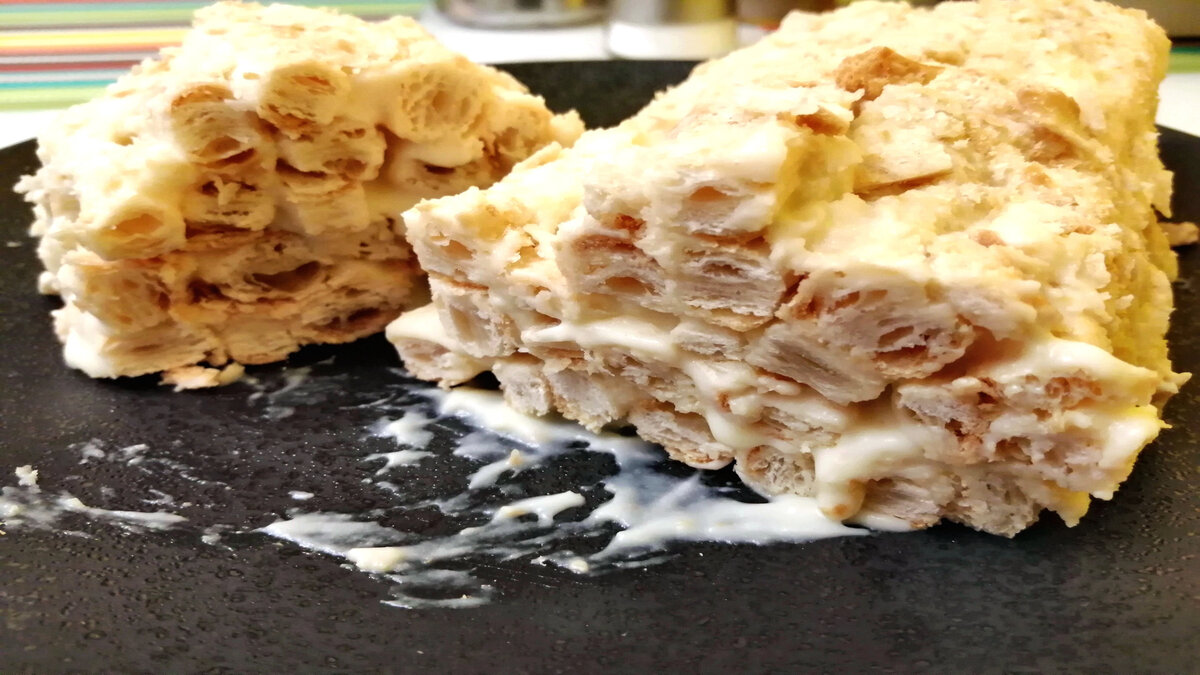 Из готового слоенного теста делаем крошку, не особо много. Крошка нам понадобится для украшения торта.