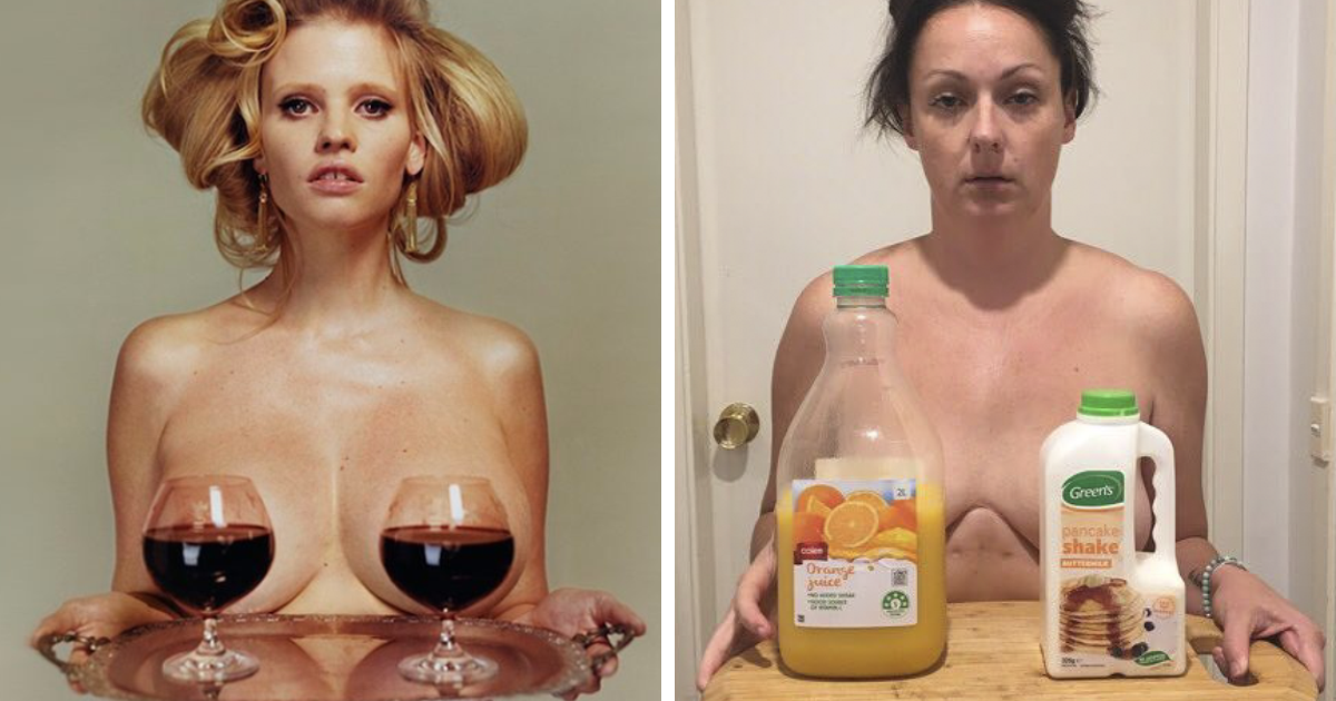 К примеру, последняя ее последняя фотография пародирует известную фотографию Лары Стоун, на которой она стоит обнаженной перед камерой, прикрывая свою грудь двумя бокалами вина.